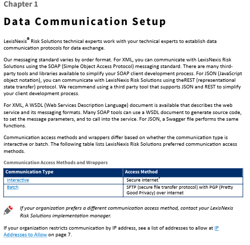 I developed comprehensive technical documentation for LexisNexis Risk Solutions, detailing the Data Communication Setup process for external clients. This document guided technical teams on establishing secure data exchange protocols with LexisNexis systems, ensuring seamless integration and compliance with industry standards.